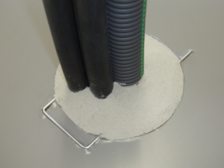 ケーブルやCD管、PF管などが混在する床の貫通部に最適なRH工法は、施工効率と柔軟性を兼ね備えた防火措置材料です。耐熱シール材RHパテは冬季でも0℃以上で柔軟性を保ち、予備加熱は不要。短時間で充填・表面仕上げが可能なため、大型マンションやホテルなど、多数の床穴を持つ現場でも効率的に施工できます。施工は、針金製受金具を床ボイド内に設置し、厚さ25mmの円形ロックウール板を挿入した後、RHパテで床一面を仕上げるシンプルな手順です。
